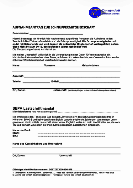Wenn Sie unseren Tennisclub kennenlernen möchten, nutzen Sie die Möglichkeit einer Schnuppermitgliedschaft für 1 Saison. Die Gebühr für die Schnuppermitgliedschaft beträgt nur 50 Euro für die komplette Sommersaison und beinhaltet keinerlei weitere Verpflichtungen. Sie endet automatisch zum Saisonende. Wenn es Ihnen bei uns gefallen hat, nehmen wir Sie danach auf Antrag gerne als Mitglied auf. Wir freuen uns auf Sie.