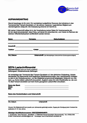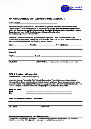 Bitte treten Sie über den Menüpunkt „Kontakt“ mit uns in Verbindung oder drucken Sie das Formular aus und senden es komplett ausgefüllt und unterschrieben an den Verein. Sie können das Formular auch scannen und per Mail schicken. Die Adressen sind unten auf dem Formular angegeben.